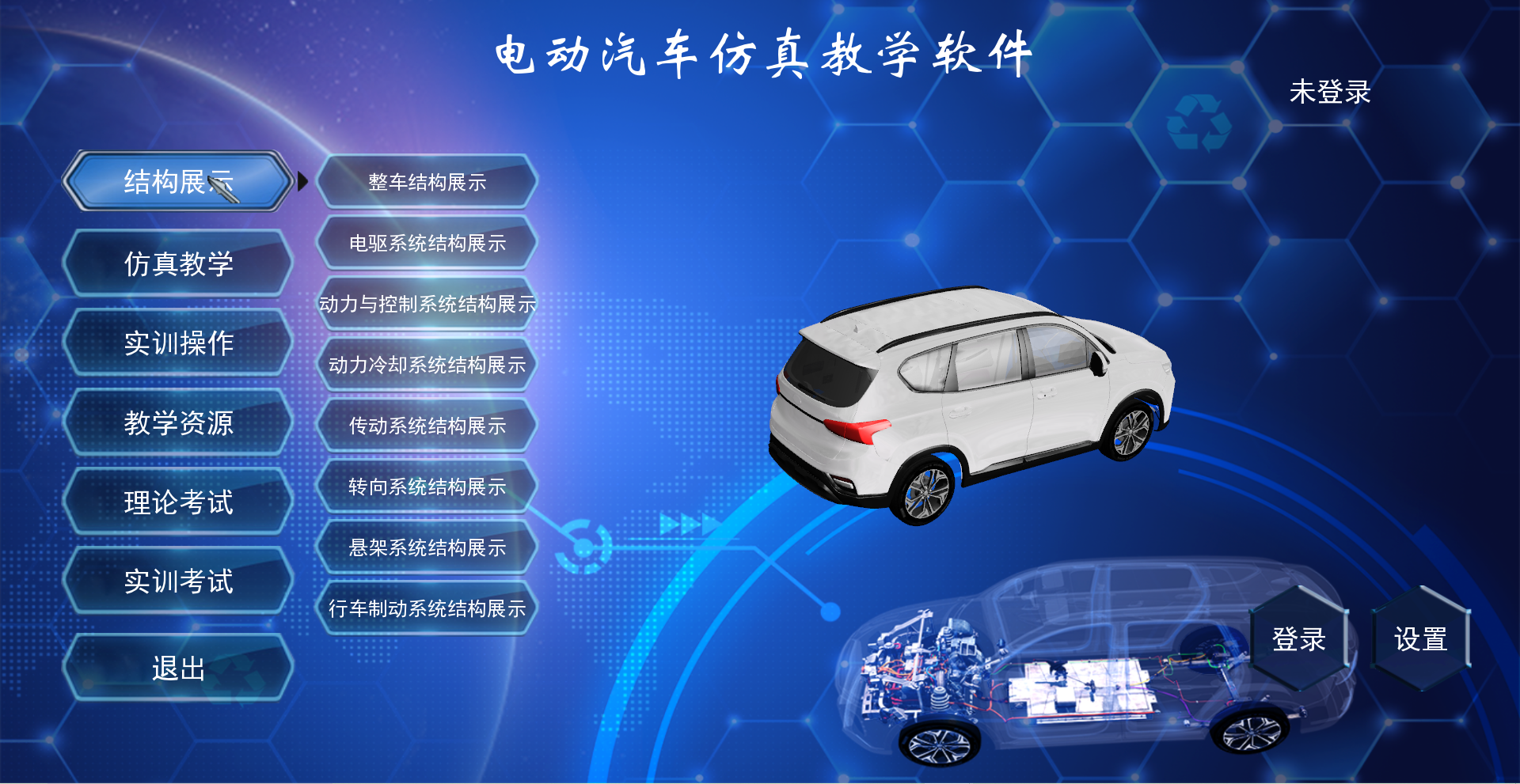 江衡軟件2024重磅推出電動汽車虛擬仿真教學軟件 電動汽車3D虛擬教學軟件 一、產品概述電動汽車3D虛擬教學軟件為學員提供電動汽車理論學習和實踐操作模擬的數字化教學平臺。在虛擬的環境下,以沉浸式的真實體驗、系統性的全方位理論學習、實操模擬訓練,培養學員掌握電驅系統;動力及控制系統;動力冷卻系統;傳動系統;轉向系統;懸架系統;制動系統幾個模塊核心零部件的拆裝維修能力。 二、虛擬仿真拆裝內容:1.電驅系統拆卸/裝配零部件u 減速器油排空和加注u 減速器懸置的更換u 減速器懸置支架的更換u 減速器后懸置的更換u 驅動電機懸置的更換u 驅動電機懸置支架的更換u 電驅系統總成的更換u 差速器半軸油封的更換 (左側)u 差速器半軸油封的更換 (右側)u 電驅單元總成和減速器的更換u 減速器總成的解體u 輸入軸總成的更換u 中間軸總成的更換u 差速器總成的更換 電驅系統拆裝仿真2.動力及控制系統拆卸/裝配零部件u 動力電池的更換u 維修開關的更換u 高壓配電箱的更換u 車載充電機的更換u 整車控制器的更換3.動力冷卻系統拆卸/裝配零部件u 電子水泵的更換u 水溫傳感器的更換u 散熱器及風扇總成的更換u 膨脹水箱的更換u 充電機至電機水管的更換u 電子水泵至充電機水管的更換u 電機至散熱器軟管的更換u 膨脹水箱至水泵軟管的更換u 散熱器至膨脹水箱軟管的更換4.傳動系統拆卸/裝配零部件u前輪驅動半軸的更換-右側u 前輪驅動半軸的更換-左側u 等速萬向節和等速萬向節防塵罩的更換u 三銷萬向節和三銷萬向節防塵罩的更換5.轉向系統拆卸/裝配零部件u轉向機外拉桿的更換u 轉向機總成的更換u 轉向機護套的更換u 方向盤總成的更換u 轉向管柱的更換u 轉向中間軸的更換u 轉向中間軸延長軸的更換6.懸架系統拆卸/裝配零部件u轉向節的更換u 下擺臂的更換u 下擺臂球頭的更換u 穩定桿連接桿的更換u 前穩定桿的更換u 前穩定桿襯套的更換u 前輪轂軸承的更換u 前減振器柱及彈簧總成的更換u 下擺臂后襯套的更換u 后懸架減振器的更換u 后鋼板彈簧總成的更換u 后懸架緩沖塊的更換u 后橋橫梁總成的更換u 車輪的更換7.行車制動系統拆卸/裝配零部件u制動盤檢查u 前制動片的更換u 前制動盤的更換u 前制動鉗總成的更換u 踏板總成的更換u 制動踏板位置傳感器的更換u 后制動鼓的更換u 后駐車制動蹄片的更換u 后鼓式制動器的更換u 真空助力器總成的更換u 主缸和儲液罐總成的更換u電子真空泵的更換u 真空筒的更換u 制動系統排空 u 駐車制動手柄總成調節u 駐車制動手柄總成的更換u 駐車制動拉索的更換u ABS 控制模塊的更換uABS 控制模塊支架的更換u 前輪轉速傳感器的更換u 后輪速傳感器的更換三、軟件功能特征:結果展示:爆炸圖的形式演示電動汽車各部分結構,生動的內容演示,增加趣味性教學。仿真教學:通過動態透視的三維動畫演示,學習各機械模塊的拆卸與裝配操作,掌握步驟要領。實訓操作:學員可對零部件進行自主拆裝操作,系統給予學員關鍵步驟、操作對象、使用工具等提示,加強學員對拆卸/裝配流程的認識,增加教學的趣味性、互動性、生動性;同時,可規避機械事故等問題,可反復實操。教學資源:滿足學生們理論實踐共同學習的優勢,教師可以上傳豐富的PPT教學課件為學生學習提供輔助理論教學。理論考試:支持多人同時在線,教師可進行綜合評分或系統自主評分,自動登記成績,實現考核量化評估。實訓考試:三維虛擬交互考核,記錄學員每一步操作并實時評分,自動上傳至教師端,培養學員實踐、應變、思維、綜合評判能力。 查看詳細